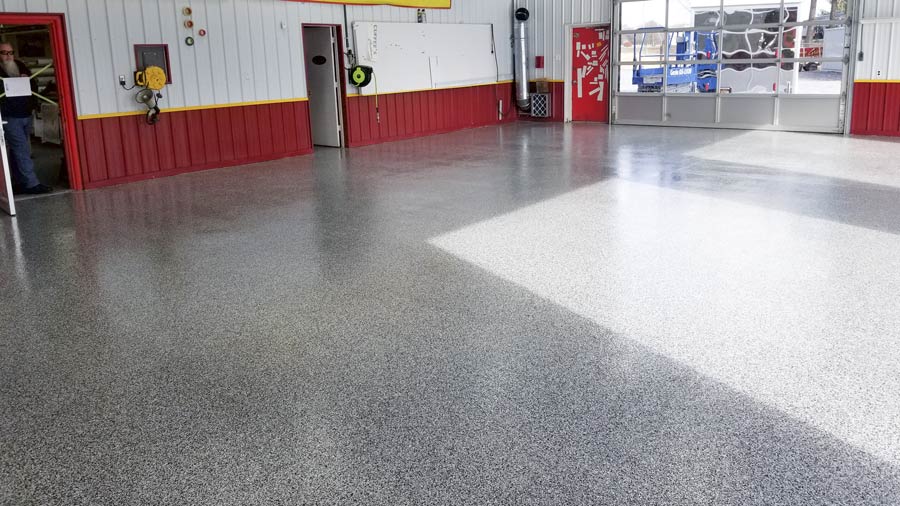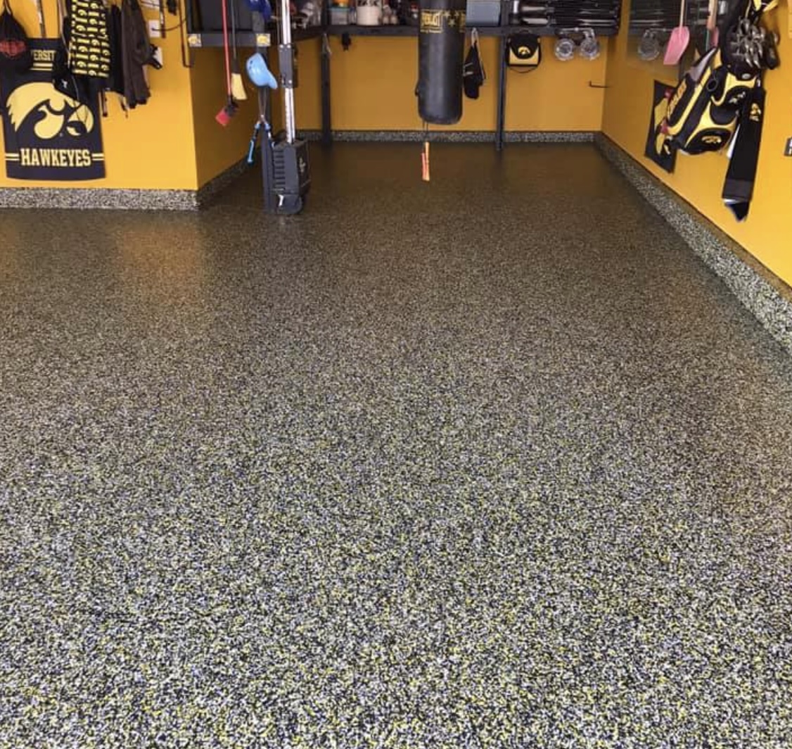 We have perfected a six step process for applying Polyaspartic Floor Coatings that involves prepping the floor, basecoating, applying chips, scraping the chips, and applying the clear UV protective clear coat.